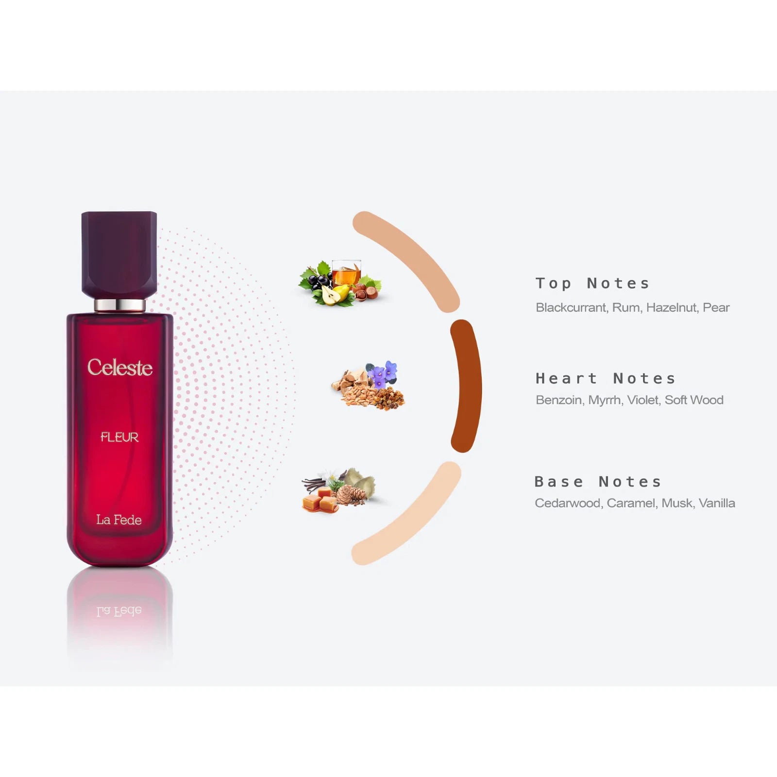 Celeste Fleur by La Fede is a refined women’s EDP tailored for those who cherish elegance in every drop. This creamy fruit‑gourmand masterpiece opens with decadent season performances, blossoms into an aromatic resinous heart, and settles into a soft caramel‑vanilla base—offering warmth, sophistication, and an enduring feminine allure.