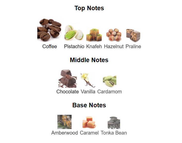 Top Notes: ☕ Coffee · 🌰 Pistachio · 🌰 Hazelnut · 🍰 Praline · 🥮 Knafeh