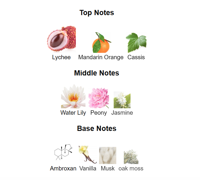 From the first spray, a burst of lychee, mandarin, cassis, and orange captures attention with juicy, sun-ripened sweetness. The heart unfolds into a luminous floral trio of water lily, peony, and jasmine, adding fresh elegance and timeless charm. As the scent dries down, a rich base of ambroxan, vanilla, musk, and vetiver blossoms—ensuring creamy depth, sensual warmth, and sophisticated longevity.