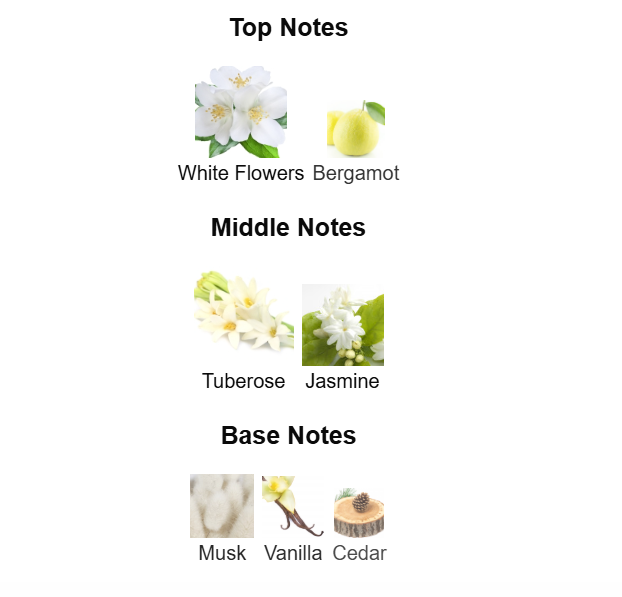 Heart Notes: 🌼 Jasmine, 🌺 Tuberose, ⚪ White Flowers